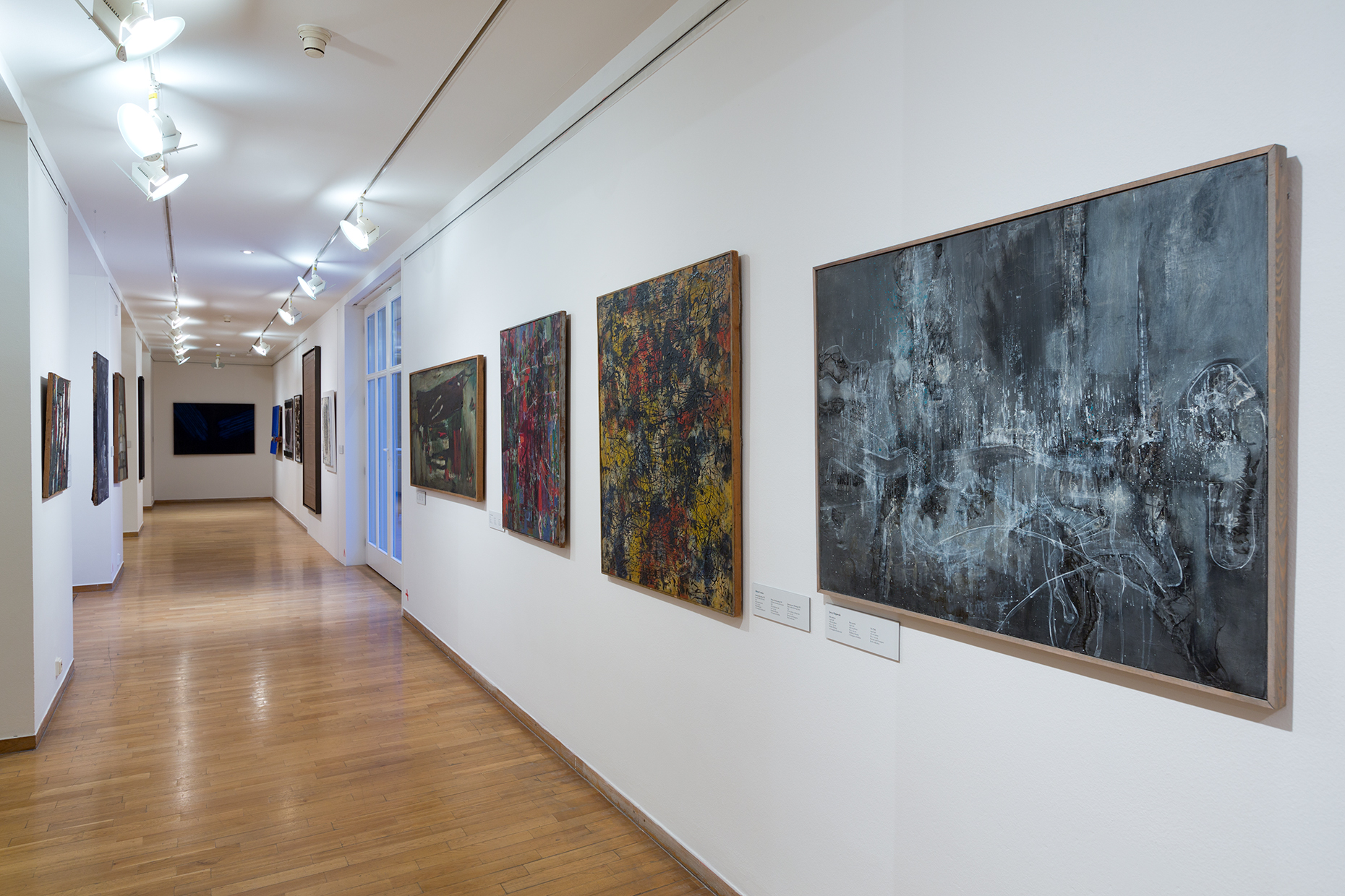Przestrzeń centralna, od lewej obraz Romualda Oramusa (2007-2010) oraz obiekt (1980) i dwa obrazy Jana Pamuły (1980, 1991), w głębi obraz Mieczysława Janikowskiego (1965), pośrodku obraz Stefana Gierowskiego (1992) oraz siedem prac Henryka Stażewskiego z lat 1958 – 1986, od prawej dwa obrazy Koji Kamoji z 2015 roku, w głębi prace: Adama Marczyńskiego (ok. 1970), Jana Berdyszaka (1973-1974), Jana Ziemskiego (1965-1966, 1971-1972).