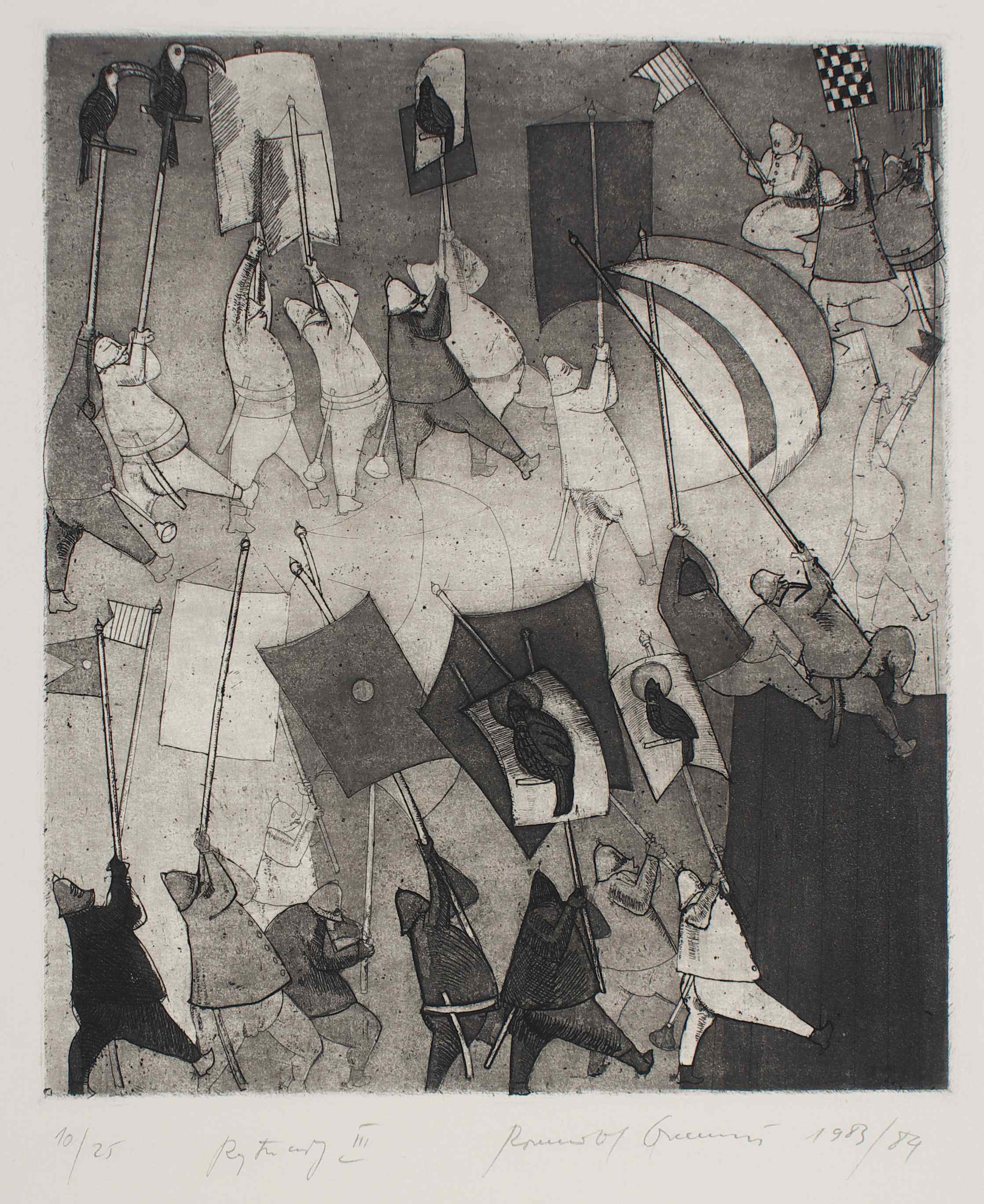 Oramus napisał (…) grafiki  pierwszej serii wykonywane były w odległości 2-3 metrów od  bojowych oddziałów, w małych grupkach przemierzających tupotem żołnierskich butów po  krakowskiej Alei Trzech Wieszczów w czasie godziny milicyjnej stanu wojennego w latach 1981-83.  W tym czasie tam bowiem mieszkałem na parterze międzywojennej kamienicy. Mój stół do pracy stał tuż przy oknie. Przez uchyloną zasłonę, przy lekko świecącej lampie miałem znakomite pole obserwacji karykaturalnych postaci w misiowych czapkach, i wygiętymi pałkami u pasa. W wyobraźni stawały się one bardziej szczotkami - wyciorami do czyszczenia klozetów, czy też pompkami do przetykani zatkanych umywalek. Rynsztunek wojskowy, zrzuconych do miasta chłopaków z różnych części kraju, imaginacyjnie stawał się też skrzyżowaniem munduru generalissimusa i herosa ochotniczej straży pożarnej. Nad wszystkim zdawało się widzieć fruwające latawce politycznego okrucieństwa i ludowej przaśności. Zamiast wrony jedynie tukany i papugi – ptaki wyjątkowo dziobate, jakby krakały, bądź paplały zadekretowaną melodię (…). [ zob. str. oramus.art  Refleksje:  R. Oramus, Szalone lata 80. i 90.]