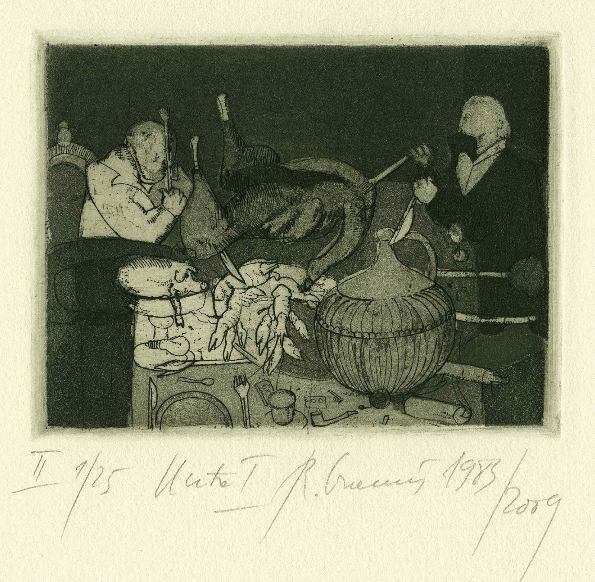 Zaś na temat powstania cyklu Uczta : (...) Lata 80 i 90. to nie tylko czas politycznej konfrontacji, ale także czas prozy życia. Uciążliwości reglamentacji brakujących produktów, szarzyzny otoczenia, bezsensu lub ograniczenia życiowych celów. Rytowane  i malowane uczty są groteskowym obrazem pragnienia konsumpcji w czasie kryzysu. Walka i zabiegi o podstawowe spożywcze produkty przybiera tu znamiona pojedynku małej grupy ludzi, najczęściej dwojga lub trojga siedzących za wspólnym stołem. Usadowieni, uzbrojeni w noże i widelce,  przy pustych lub suto zastawionych, wydłużonych stołach,  prowadzą swoisty dialog absurdu. Karykaturalnie przedstawieni są paradoksalnie osaczeni nadmiarem dóbr, takich jak ponadwymiarowe indyki, gęsi, wszelakie ryby, kawał wołu lub wieprza. Na tych  stołach, spłaszczonych i widzianych jakby z góry znajdują się jeszcze najbardziej niestosowne przedmioty i rekwizyty. W nadrealistycznym zestawieniu egzemplarz codziennej prasy, kotwice, sieci rybackie, karty do gry, drobne codzienne utensylia, stolarsko- rzemieślnicze narzędzia, zderzone są znaczeniowo z wszelakimi okruchami i odpadami życia. Rytuał gloryfikacji upragnionego jadła ma tu charakter misteryjny. Za stołem odbywa się swoista bałwochwalcza modlitwa, w której dobra konsumpcji to odpowiednik kultu złotego cielca (…) [ zob.  j.w. str. oramus.art  Refleksje]