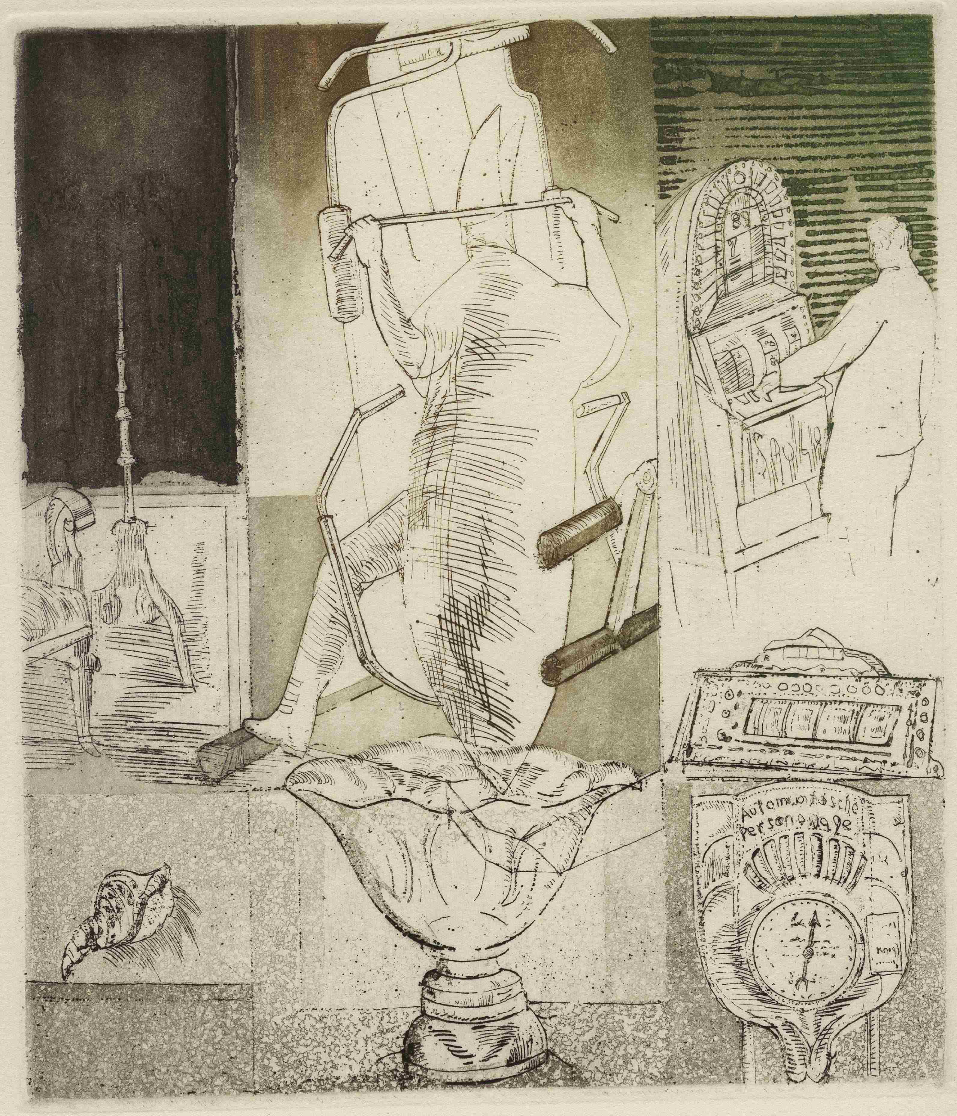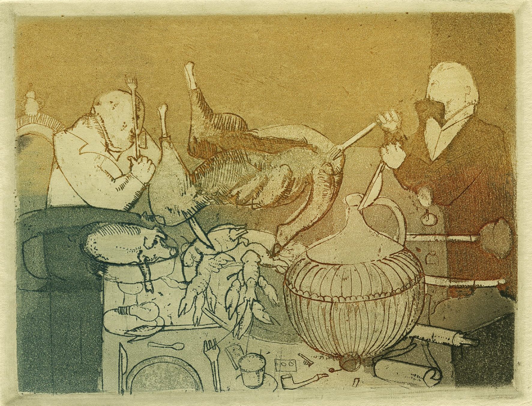 Malowane akty to popis techniki olejno-żywicznej [8], z całym wachlarzem jej wyrazowych możliwości. Stopień nasycenia barwy, pomimo ograniczenia palety do pochodnych brązów, optycznej czerni, wszelakich szarości, wielości bieli i opozycyjnych uderzeń światła, jakby złota czy lśnienia bursztynu, koreluje z finezyjną techniką wykorzystania akwaforty w połączeniu z suchą igłą. Mamy tu perfekcyjne i wręcz magiczne wyczucie fuzji ostrej kreski trawionej techniki i miękkości uzyskanej rytowaniem bezpośrednio na płycie (połączenie szczególnie widoczne w ażurze zgiętych rąk siedzącej).