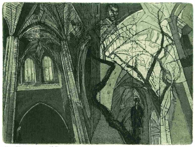 Pierwsza grafika – inicjująca cykl Katedra Prousta – obrazuje stan przeczucia, zbliżania się Marcela Prousta do ostatecznej decyzji odnośnie istoty swych twórczych intencji. Na czym miałyby polegać jego pisarskie zamiary, rodząc pytanie – co może stać się ostatecznym sensem jego życia? [...]