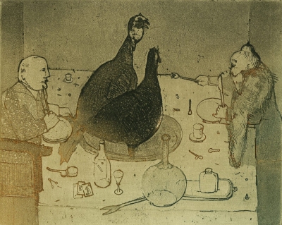 W latach 90. XX w. bohaterowie moich obrazów schodząc ze sceny publicznej przestali być świadkami historii, raczej „na parkiecie”, „na dywanie” snują swe małe sny o potędze. Mają mniej karykaturalne fizjonomie. Bardziej groteskowe są sytuacje – pretensjonalne i banalne, w których się znajdują, lub o których marzą. Niemniej nadal zauważamy grę paradoksu, humor sytuacyjny, ton moralizatorski, ujmowany z przymrużeniem oka.