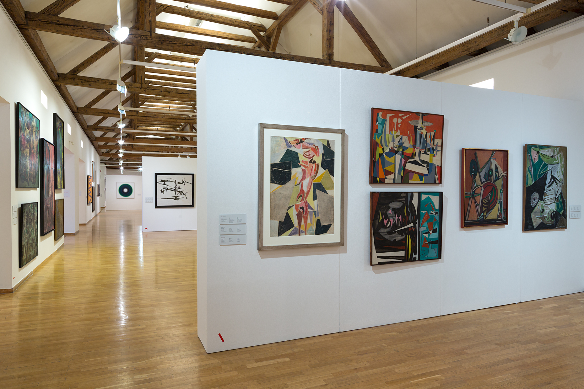 Przestrzeń centralna, od lewej obraz Romualda Oramusa (2007-2010) oraz obiekt (1980) i dwa obrazy Jana Pamuły (1980, 1991), w głębi obraz Mieczysława Janikowskiego (1965), pośrodku obraz Stefana Gierowskiego (1992) oraz siedem prac Henryka Stażewskiego z lat 1958 – 1986, od prawej dwa obrazy Koji Kamoji z 2015 roku, w głębi prace: Adama Marczyńskiego (ok. 1970), Jana Berdyszaka (1973-1974), Jana Ziemskiego (1965-1966, 1971-1972).