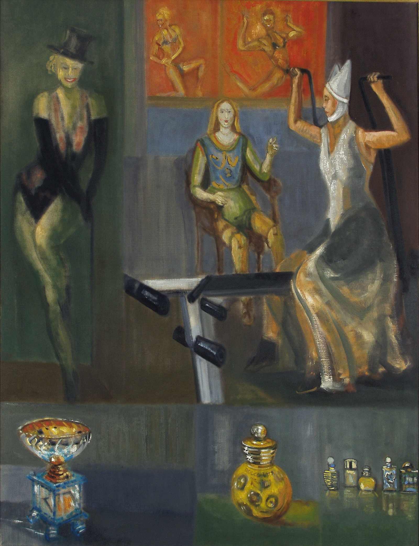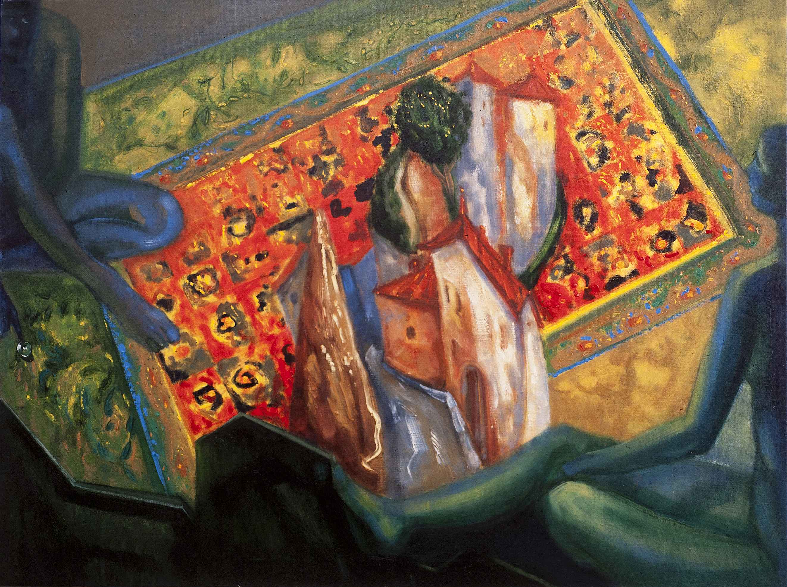 W latach 90. XX w. bohaterowie moich obrazów schodząc ze sceny publicznej przestali być świadkami historii, raczej „na parkiecie”, „na dywanie” snują swe małe sny o potędze. Mają mniej karykaturalne fizjonomie. Bardziej groteskowe są sytuacje – pretensjonalne i banalne, w których się znajdują, lub o których marzą. Niemniej nadal zauważamy grę paradoksu, humor sytuacyjny, ton moralizatorski, ujmowany z przymrużeniem oka.