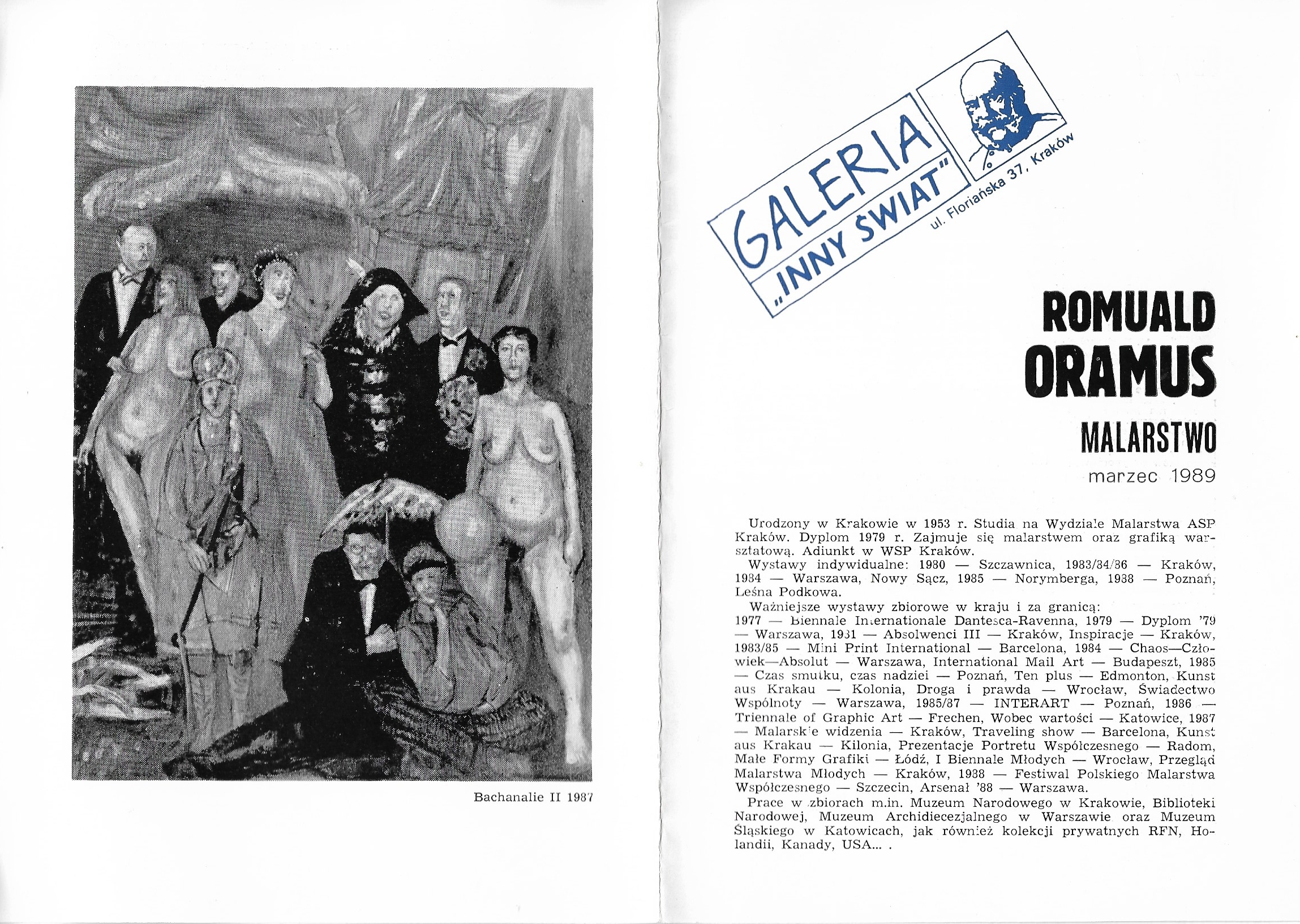 O artyścieWystawyWybrane wystawy indywidualneRomuald Oramus, Bachanalie, malarstwoGaleria Inny Świat, Kraków 1989