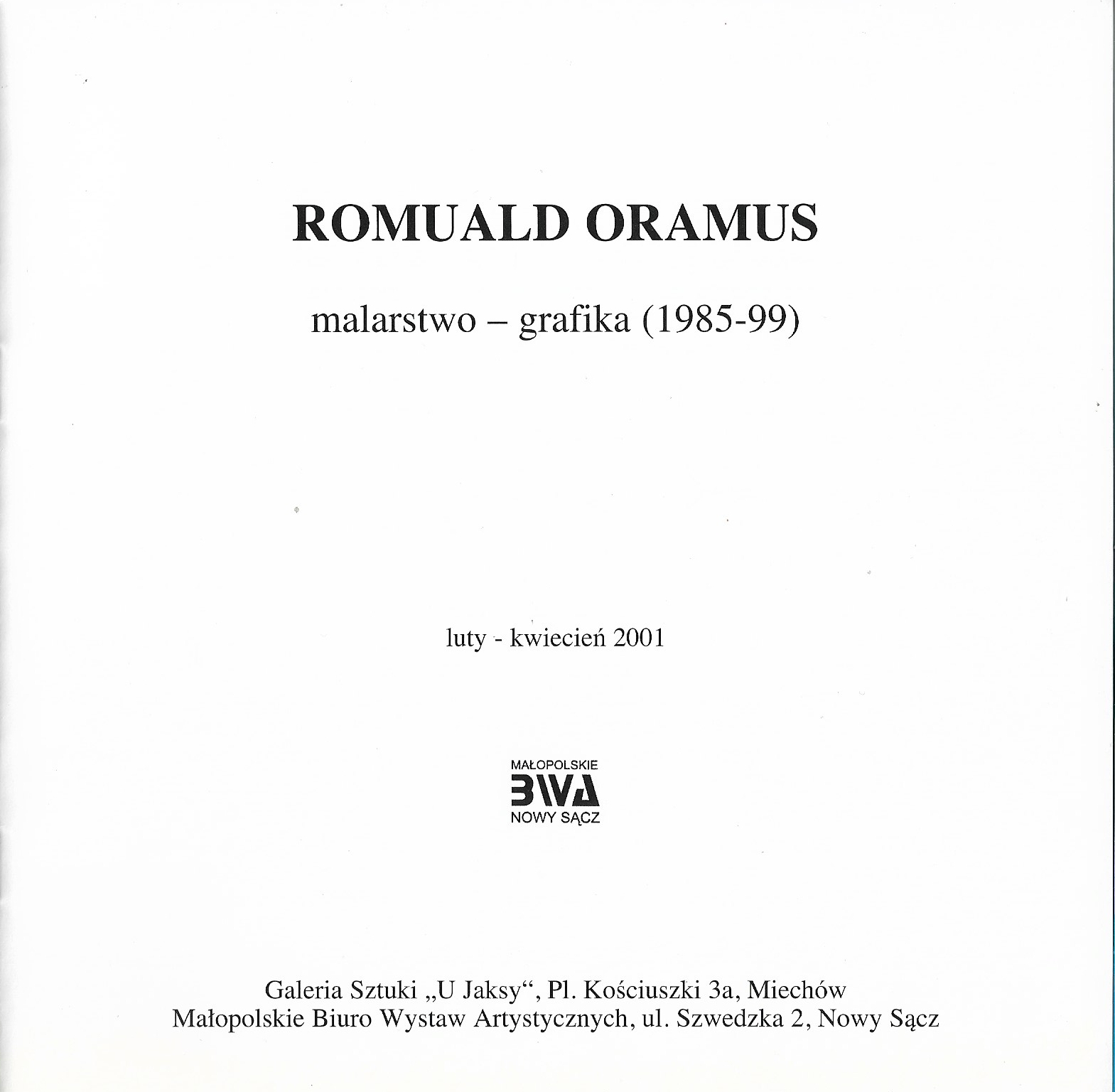 O artyścieWystawyWybrane wystawy indywidualneRomuald Oramus, malarstwo- grafika 1985 - 1999 Galeria MBWA, Nowy Sącz 2001